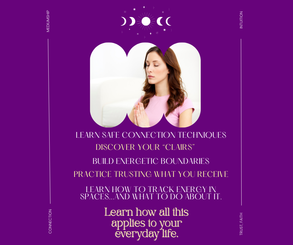 • Discover your ‘Clairs’ (How you personally perceive and connect feel/see/know/hear, with spirit and energy)